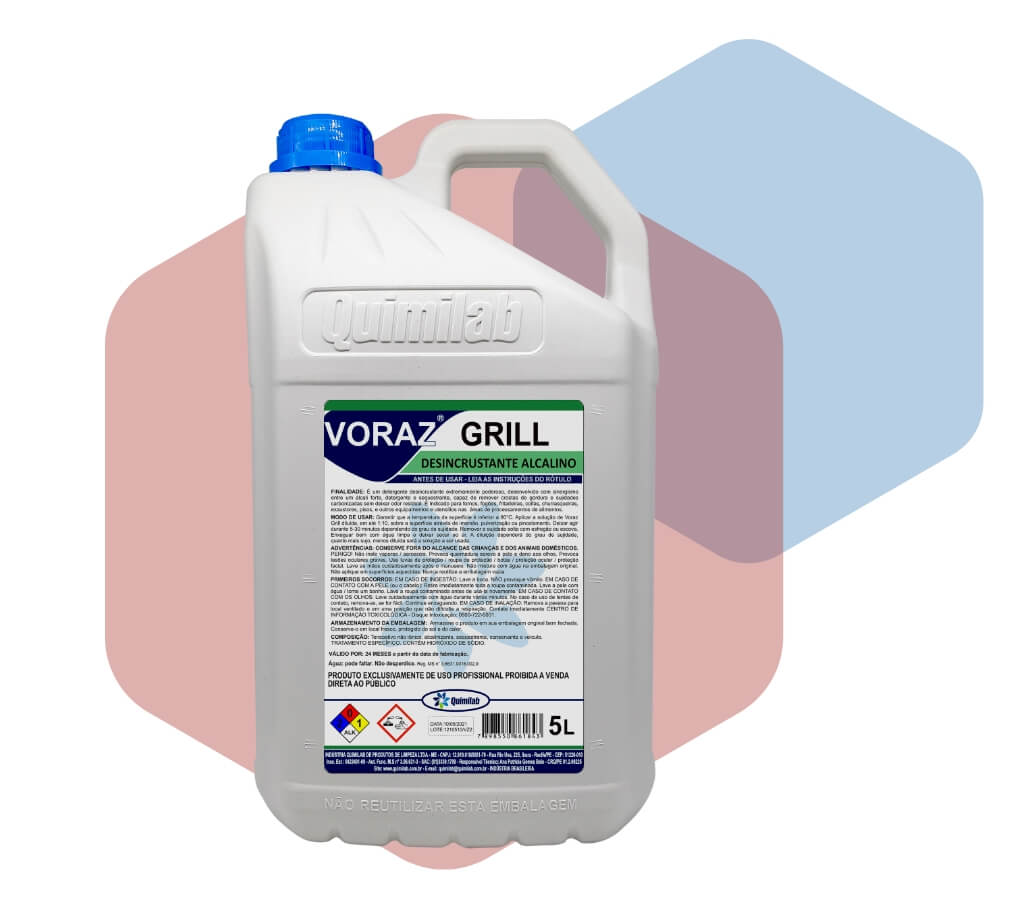 O VORAZ GRILL DESINCRUSTANTE ALCALINO 5L é um poderoso desincrustante alcalino desenvolvido pela Quimilab, especialmente formulado para remover gorduras carbonizadas, incrustações e resíduos difíceis de superfícies de grills, fornos, chapas e equipamentos de cocção em geral. Sua ação potente facilita a limpeza pesada, restaurando a eficiência dos equipamentos e garantindo um ambiente mais higiênico e seguro.